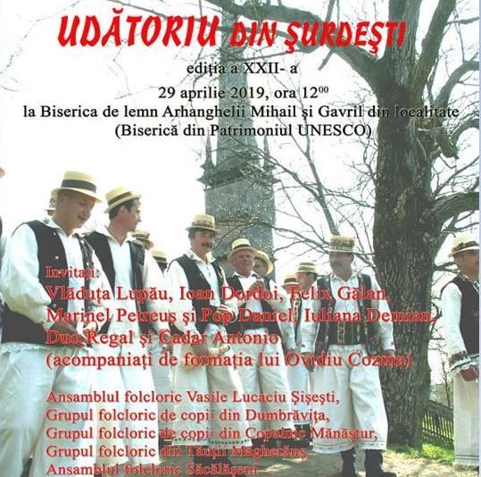 Denumit “Udatoriu din Şurdesti”, ceremonialul agrar începe imediat după slujbă din biserică, cel mai harnic țăran fiind condus de la biserică la râu, unde este udat cu apă, după care se încinge petrecerea. Se lasă cu ospăţ şi joc la casa sărbătoritului.Feciorii și fețele tinere se adună în tinda bisericii, unde este adus udătorul în fața preotului, care dă dezlegarea obiceiului.Apoi are loc o “confruntare” între tineri aleşi și diac, care este “mituit” cu un litru de palincă să deschidă biserică. Apoi este anunțat numele udătoriului, după care se împart “funcţiile”. Acțiunea se mută apoi la udator acasă, unde o monedă este ascunsă într-o buturugă, iar feciorii trebuie să o găsească, caz în care udatorul încearcă să fugă.De aici, alaiul merge la râu, unde udătorul este dus cu o tileguţa, din care va încerca mereu să scape, să fugă. Ajunși acolo, acesta este udat cu apă, iar el, la rândul lui, îi udă pe cei tineri.Organizatorii evenimentului au pregătit şi un program artistic. Pe scenă vor urca invitaţi precum Vlăduţa Lupău, Ioan Dordoi, Felix Gălan, Marinel Petreuş şi Pop Daniel. De asemenea mai multe ansambluri folclorice au îi vor încânta pe cei prezenţi la manifestare.