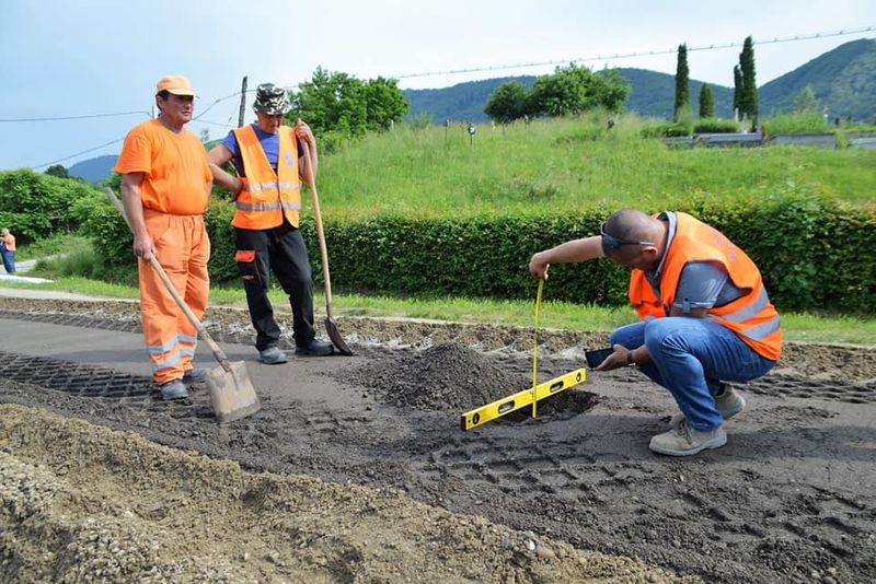 ”La acostamentul drumului se lucrează în paralel cu procesul de reciclare, prin așezarea unui strat de piatră spartă cilindrată, care să asigure o masă compactă, evitând astfel evenimentele neplăcute atunci când se iese de pe carosabil”, a precizat președintele Consiliului Județean, Gabriel Zetea.