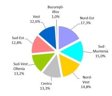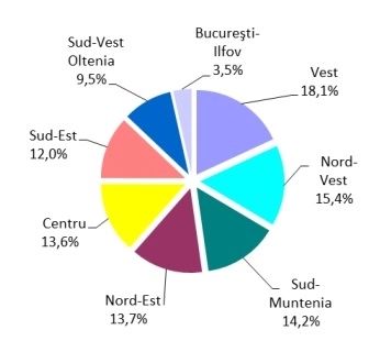 Structura lungimii rețelei de căi ferate în exploatare, pe regiuni de dezvoltare, la 31 decembrie 2022