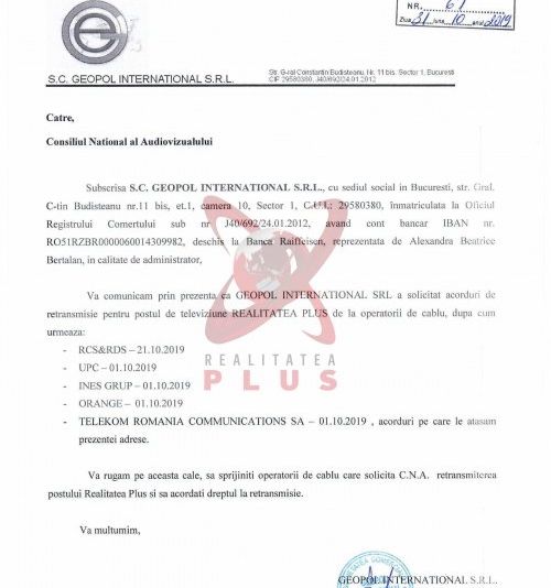 Consiliul Naţional al Audiovizualului întârzie să notifice companiile de cablu să preia în grila de programe Realitatea Plus.