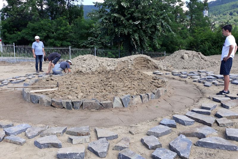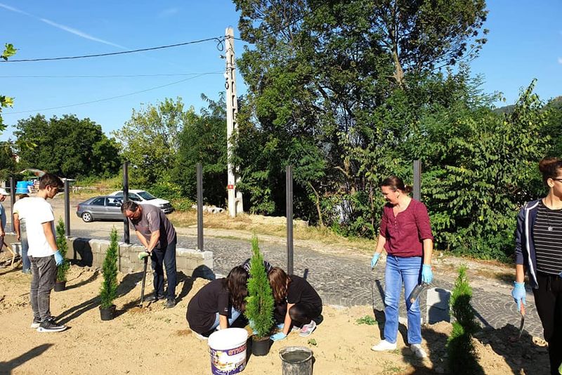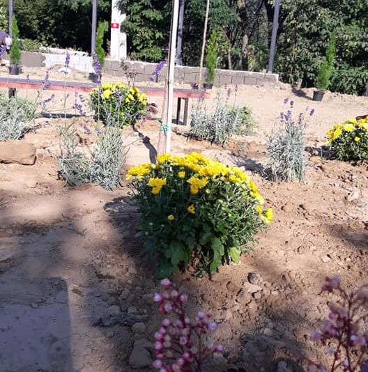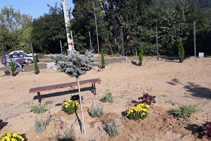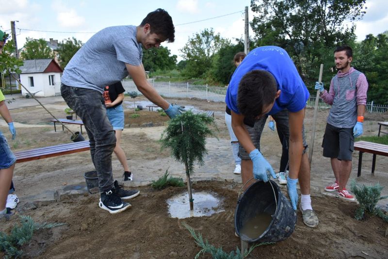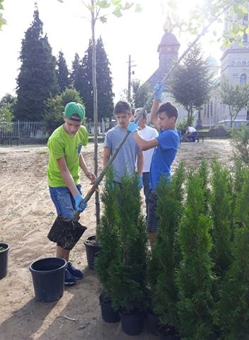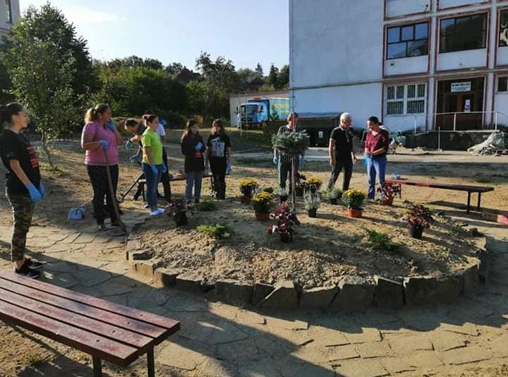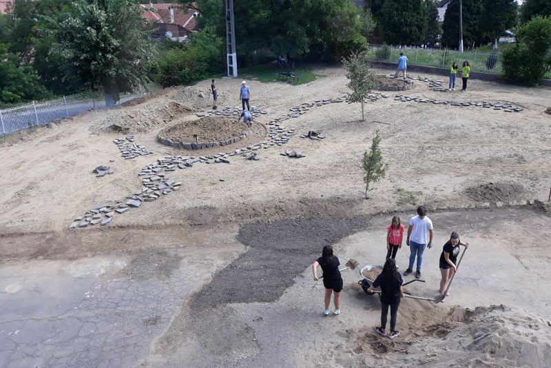 De-a lungul vacanţei de vară elevi, tineri voluntari, părinţi, cadre didactice şi personalul administrativ al şcolii au lucrat împreună pentru amenajarea terenului, crearea aleilor din piatră şi a rondourilor de flori, amplasarea băncuţelor din lemn, plantarea arbuştilor, a platanilor şi a florilor.