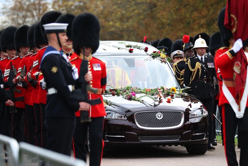 Sicriul, montat pe un afet de tun tras cu ajutorul unor frânghii de marinari din Royal Navy, a străbătut în procesiune străzile din centrul capitalei britanice până la Arcul Wellington, urmat de regele Charles al III-lea, prinţul William de Wales şi alţi membri ai familiei regale.