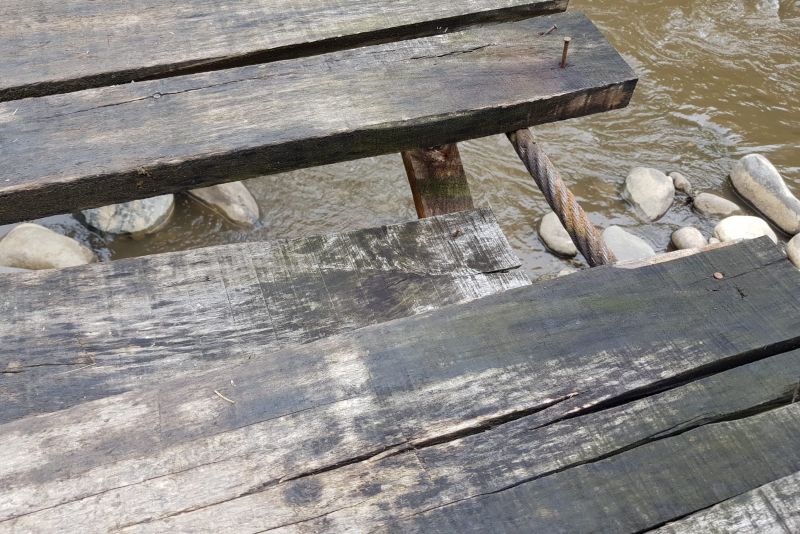 Un localnic ne-a trimis mai multe imagini cu puntea peste râul Cosău. În imagini se poate observa cum lipsesc mai multe traverse din punte, o parte din scânduri sunt desprinse, iar altele sunt rupte.