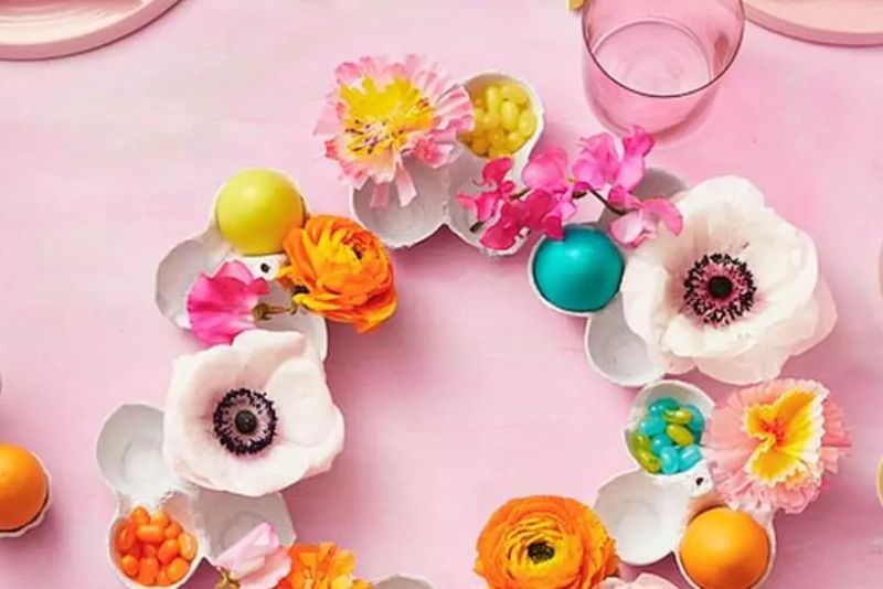 O altă decorațiune pentru masa de Paște este coronița suport din bucăți de cofraj de ouă. Taie bucăți de câte patru spații pentru ou din cofraj și vopsește-le în alb cu acrilic, dacă ai, dacă nu, poate rămâne cofrajul simplu, nu-i așa?! Lasă-le apoi să se usuce complet și apoi aranjează-le în formă de coroniță în centrul mesei. Decoreaz-o cu ouă colorate și bomboane.