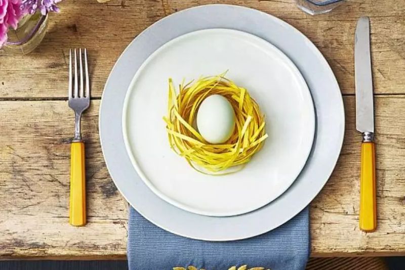 Nu doar masa merită decorată, ci și farfuriile. Pentru aperitiv, fă un cuib în centrul farfuriei dintr-o mână de tăieței în care să așezi un ou colorat.