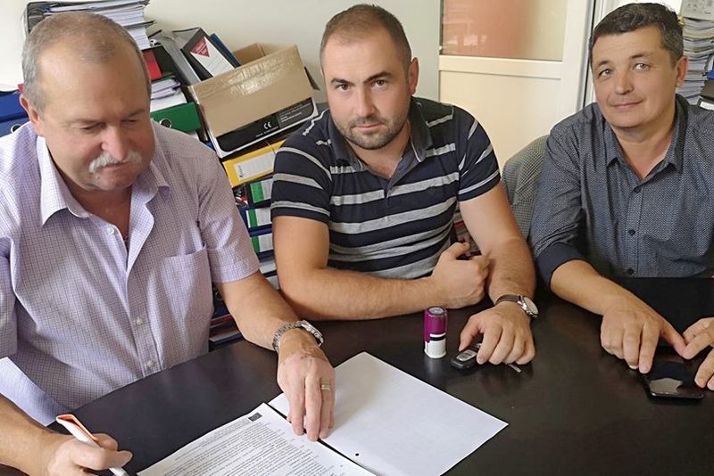 Astăzi primarul comunei Ocna Șugatag, Mihai Ivaszuk, însoțit de inspectorul Ioan Oanea și inginerul Radu Tiplea, a semnat contractul de finanțare privind înființarea terenului de sport din Sat Șugatag, contract cu o valoare eligibila de 70.000 de euro.