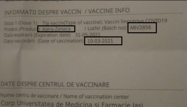 Aceeași sursă susține și că în România sunt folosite vaccinuri din lotul ABV2856 Astra Zeneca, interzis astăzi în Italia. Până în prezent, autoritățile române nu au făcut nici un anunț despre utilizarea acestui lot, însă, după cum o dovedește exemplul de mai jos, vaccinarea a avut loc miercuri, 10 martie, într-un centru de vaccinare din municipiul Iași.
