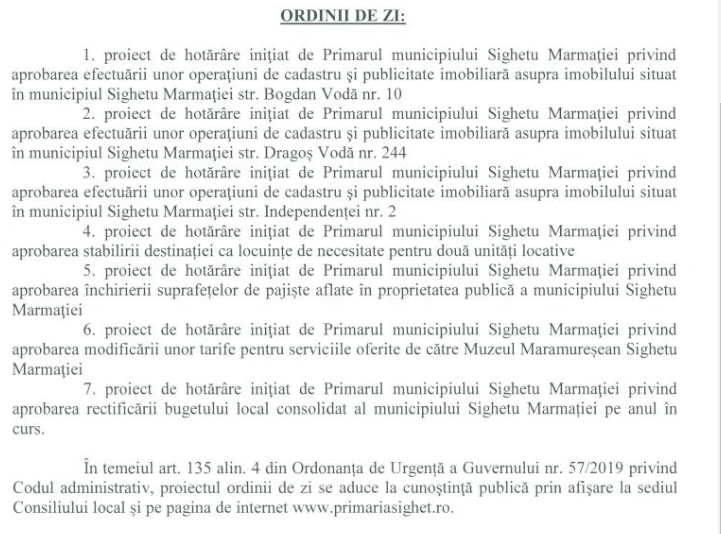 Pe ordinea de zi se regăsesc și 3 proiecte de hotărâre privind aprobarea unor operațiuni de cadastru și publicitate imobiliară asupra unor imobile situate în Sighetu Marmației. Un alt punct de pe ordinea de zi se referă la aprobarea stabilirii destinației ca locuințe de necesitate pentru două unități locative.